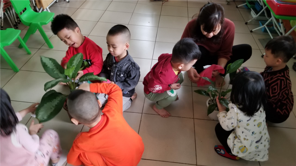 Cô hướng dẫn một nhóm trẻ lau lá cây