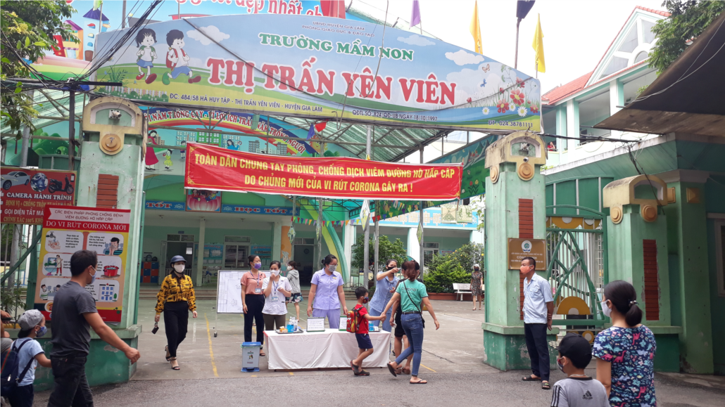 Ngay đầu giờ, ban giám hiệu nhà trường đã được đón đồng chí Vũ Thế Soạn chuyên viên Phòng GD&ĐT huyện Gia Lâm về kiểm tra, giám sát công tác phòng chống dịch Covit-19 trong ngày đầu đón trẻ đi học trở lại. Nhà trường cũng được nhận được sự quan tâm, hỗ trợ của các ban ngành, đoàn thể, tổ chức trên địa bàn Thị Trấn Yên Viên. Các đồng chí lãnh đạo đại diện Đảng ủy-HĐND-UBND Thị Trấn Yên Viên đã đến động viên, hỗ trợ, tặng cho nhà trường 5 máy đo thân nhiệt trị giá khoảng 5 triệu đồng. Chị Thái Thị Hải, Phụ huynh đã tặng nhà trường 200 chiếc khẩu trang.